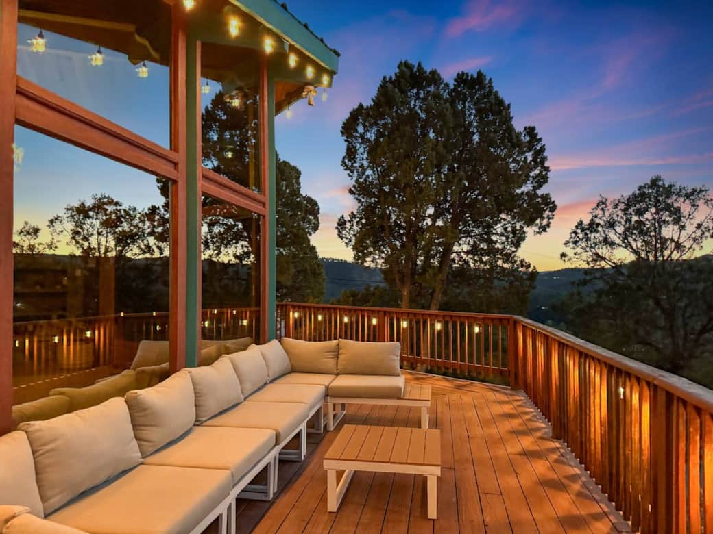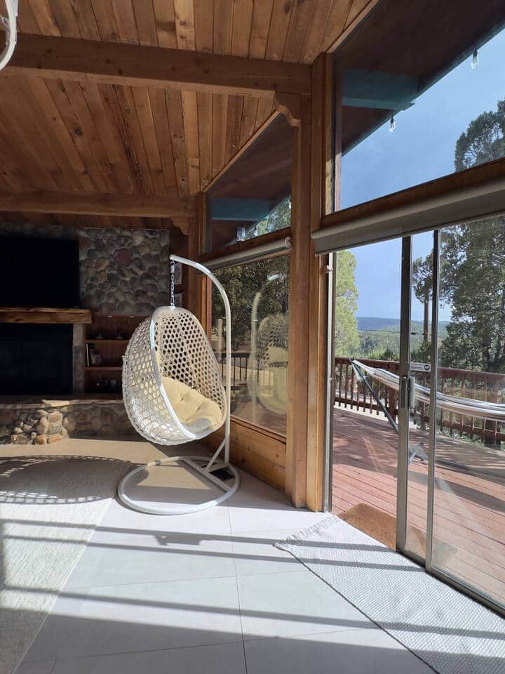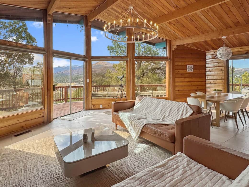 Two-story cedar cabin with stunning panoramic views of Sierra Blanca Peak. The natural wood construction gives the space a warm, rustic feel.